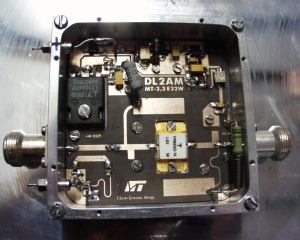 MT 2,3 - E 22 WA-400, 2,3 GHz-Linear-Power-Amplifier-Kit, one-stage-version, 20 Watt out at 400 mWatt in, max. 22 Watt out, 17,5 dB amplification, highly effective protection circuit with additional blocking circuit to eliminate high inrush currents with DC Soft Start, precisely milled solid Aluminum housing, prepared with all threads und mills, 12-15 Volt DC. I max. 4,8 Amp., built-in directional coupler with detector for monitoring the output power, with the new heavy duty Power-Gas-Fet from Toshiba, I.ds = 13 Amp. P.d = 60 Watt , Teflon board , N-connctors, tuning range 2,2 to 2,45 Ghz, housing 80 x 80 x 29 mm, published in DUBUS Issue 2/96, p.20, and ATV-Amateur Issue 1/97 Kit from DL2AM. |
