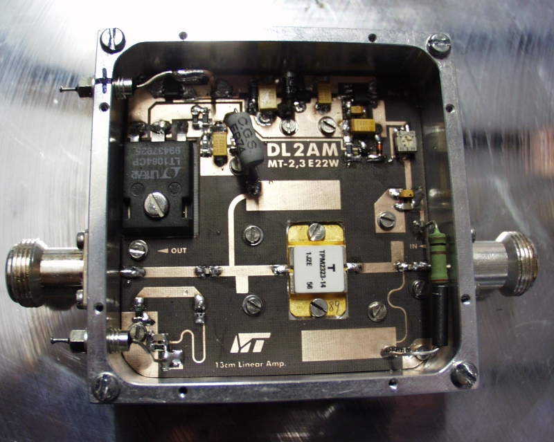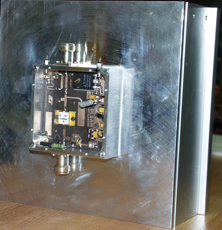 MT 2,3 - E 22 WA-400, 2,3 GHz-Linear-Power-Amplifier-Kit, one-stage-version, 20 Watt out at 400 mWatt in, max. 22 Watt out, 17,5 dB amplification, highly effective protection circuit with additional blocking circuit to eliminate high inrush currents with DC Soft Start, precisely milled solid Aluminum housing, prepared with all threads und mills, 12-15 Volt DC. I max. 4,8 Amp., built-in directional coupler with detector for monitoring the output power, with the new heavy duty Power-Gas-Fet from Toshiba, I.ds = 13 Amp. P.d = 60 Watt , Teflon board , N-connctors, tuning range 2,2 to 2,45 Ghz, housing 80 x 80 x 29 mm, published in DUBUS Issue 2/96, p.20, and ATV-Amateur Issue 1/97 Kit from DL2AM. |